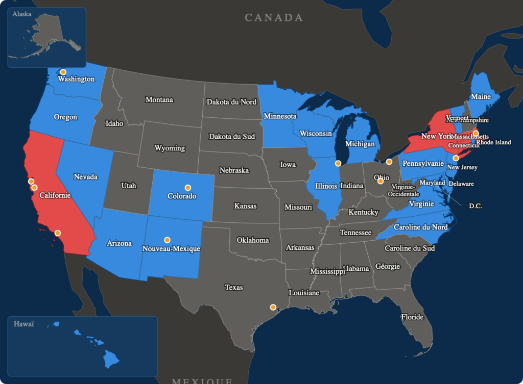 - États « refuges » (Californie, Washington, Massachusetts) : renforcement des normes et marchés du carbone.
