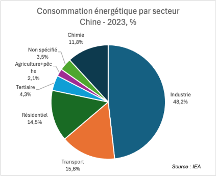 On parle de la Chine comme pionnier technologique, mais il ne faudrait pas oublier qu’elle est aussi le premier producteur de presque tous les produits industriels de base, du ciment à la chimie en passant par l’acier. Il est assez difficile d’avoir une vision claire de la répartition par secteur tant des émissions que de la consommation énergétique. Le meilleur niveau de détail est fourni, pour la consommation, par l’AIE sur base des statistiques chinoises pour 2023 et en comparaison avec la France.