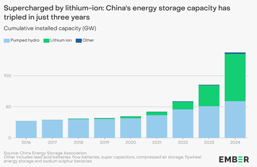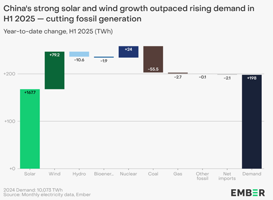 Cela commence à se traduire en production. Le graphique d’Ember pour le premier semestre 2025 montre que la nouvelle production renouvelable a largement compensé la hausse de la demande d’électricité et engagé un repli du charbon dans la production. Malgré les difficultés de raccordement et d’acheminement, il semble que la substitution du charbon dans la production électrique ait été amorcée.