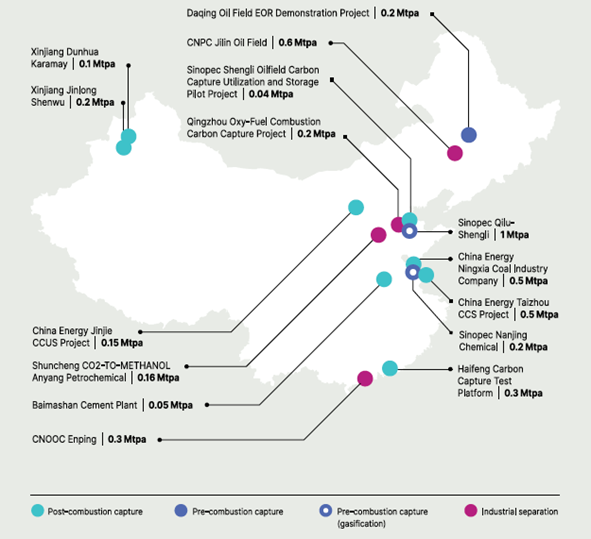 Avec une industrie lourde de premier plan, un parc de centrales à charbon considérable et jeune, il peut être plus intéressant pour la Chine de développer et industrialiser les techniques de capture et stockage de CO2 que de remplacer les installations existantes. Elle dispose aussi de structures géologiques favorables à des stockages de grande ampleur. Elle devient ainsi le pays à la fois le plus avancé et le plus proche de solutions économiques en termes de CCUS.