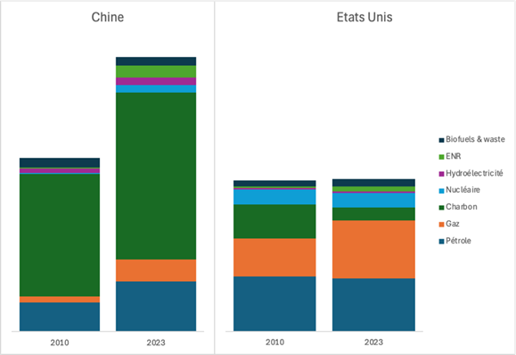 Dès 2010, la Chine devient le premier producteur mondial d’énergie ; depuis l’offre d’énergie en Chine a crû de 58% alors qu’elle stagne aux Etats-Unis. L’équation chinoise consiste à consolider sa position de leader industriel mondial tout en décarbonant progressivement son énergie. Dans une production stable, les Etats-Unis ont opéré un fort transfert du charbon vers le gaz, les énergies décarbonées ne passant que de 12 à 14% du total (dont 10 au nucléaire). En Chine, dans un contexte de croissance rapide, le charbon est passé de 70 à 61% du total, soit une croissance de 37% en volume, alors que les énergies décarbonées sont passées de 4 à 10%, soit une multiplication par 1,7 pour l’hydroélectricité, par 5 pour le nucléaire et presque 11 pour le solaire et l’éolien. Ces tendances ont encore été amplifiées depuis 2023, dernières statistiques homogènes disponibles.