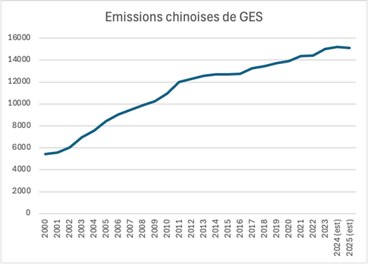 La grande nouvelle de l’année 2025 est que, d’après les premières données disponibles, les émissions chinoises de GES ont pour la première fois baissé, sanctionnant le découplage entre croissance économique et croissance des émissions. Le Climate Action Tracker (CAT) estime que les émissions de GES se sont stabilisées en 2025 à 15.1-15.2 GtCO2e par rapport à une estimation de 15.2 GtCO2e en 2024 (excl. les émissions issues du changement d’usage des terres – LULUCF : emissions from land use, land use change and forestry)