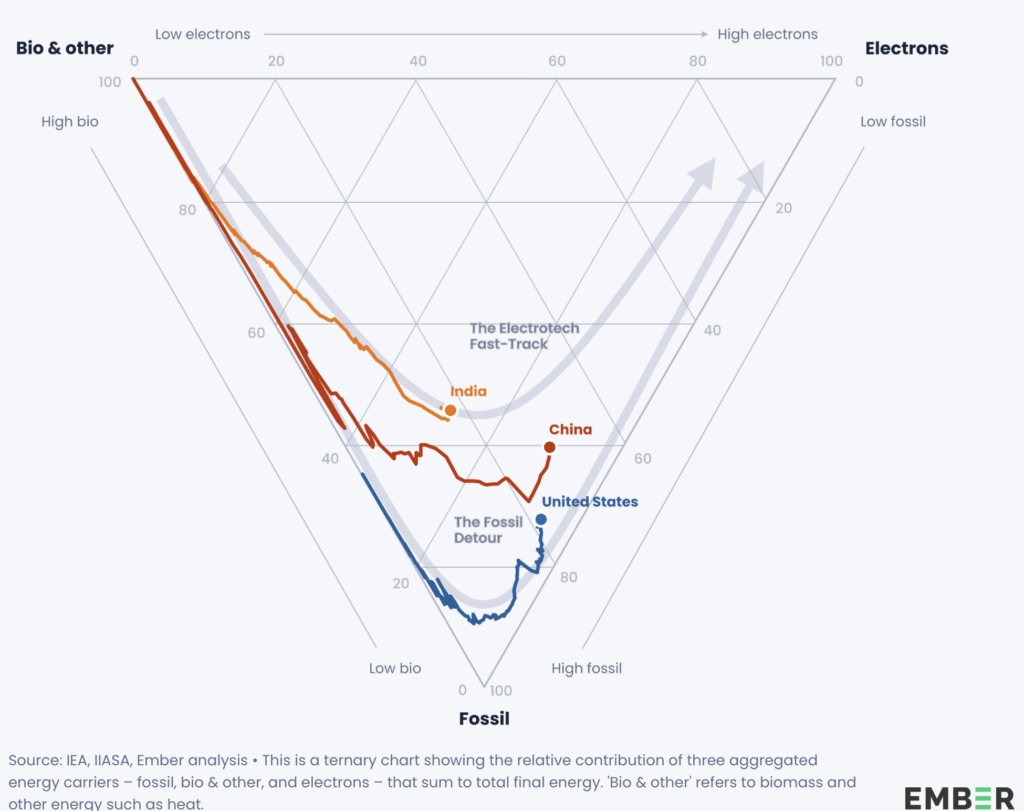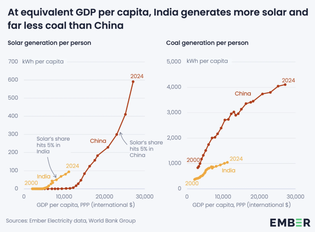 Le constat est saisissant : à niveau de richesse équivalent, l’Inde génère davantage d’électricité solaire, brûle bien moins de combustibles fossiles et électrifie ses transports plus rapidement que la Chine ne le faisait.