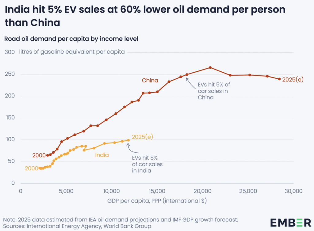 Les véhicules électriques ont dépassé 5 % des ventes automobiles mi-2025, à un moment où la consommation de pétrole par habitant est inférieure de 60 % à celle de la Chine lorsqu’elle a franchi ce même seuil. Plus remarquable encore : l’Inde est leader mondial des trois-roues électriques, avec près de 60 % des ventes dans cette catégorie. Les deux-roues suivent rapidement, avec 1,25 million d’unités vendues en 2024, soit quatre fois plus qu’en 2020.