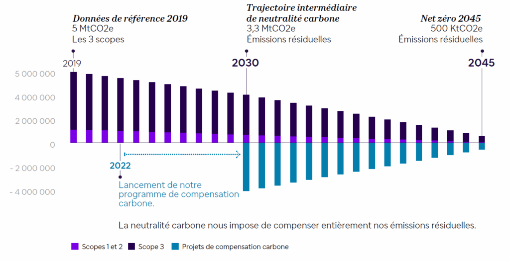 - La compensation des émissions résiduelles à court terme par des crédits carbone, et à plus long terme (2045) en s’appuyant sur des technologies d’émissions négatives (capture et séquestration de CO2 biogénique).